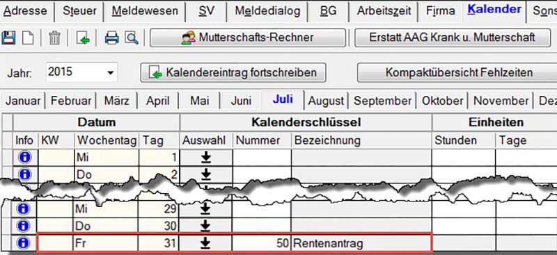 Eintrag im Kalender, um die gesonderte Meldung mit Grund 57 zum 31.07.2015 zu erzeugen