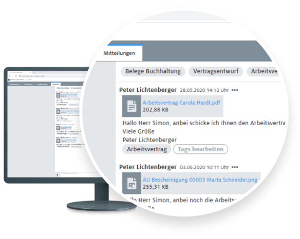 Über das Unternehmens-Portal verschicken Sie Schriftverkehr, Dokumente und Dateien an Ihren Mandanten. Umgekehrt lädt er relevante Dateien für Sie hoch, die Sie anschließend direkt in die Software einlesen.