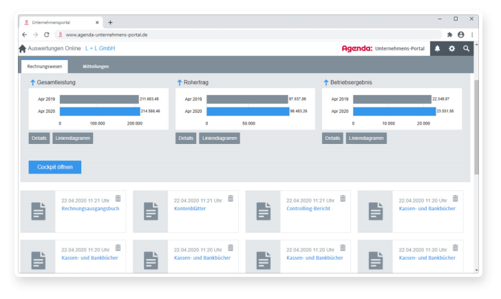 Zur schnellen Übersicht bereiten Sie die wichtigsten Unternehmenszahlen im Agenda-Cockpit grafisch auf. Dabei entscheiden Sie mandantenbezogen, welche Kennzahlen Sie im Cockpit visualisieren. Das Beste: Einmal festgelegt, erfolgt die Bereitstellung der jeweiligen Grafiken völlig automatisch.