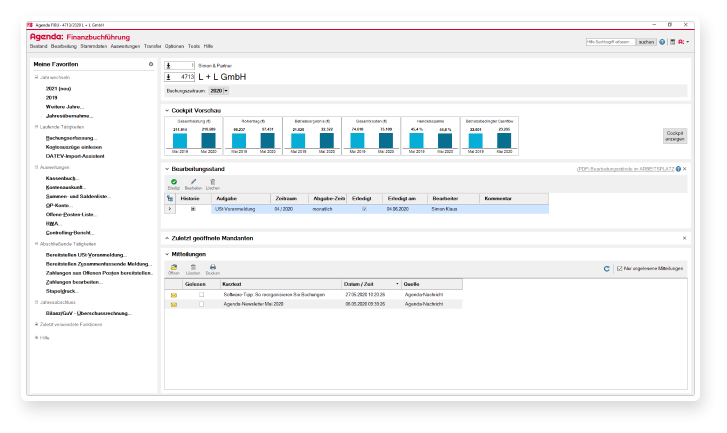 Der Datenaustausch mit Ihrem Steuerberater läuft mit Agenda völlig unproblematisch. Unabhängig davon, welches Kanzleisystem er im Einsatz hat.