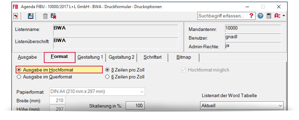 Die BWA soll im Hochformat gedruckt werden.