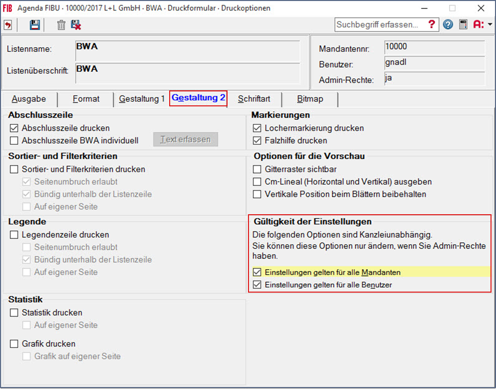 Die Druckoptionen gelten immer nur für den aktuellen Benutzer und Mandanten. Im Register »Gestaltung 2« können Sie wählen, ob die Einstellungen für alle Mandanten und Benutzer übernommen werden sollen.