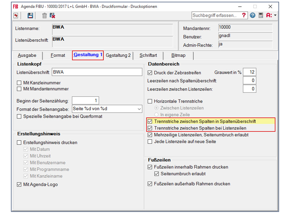 Die BWA wird jetzt im Hochformat und mit vertikalen Trennstrichen zwischen den einzelnen Spalten ausgegeben.