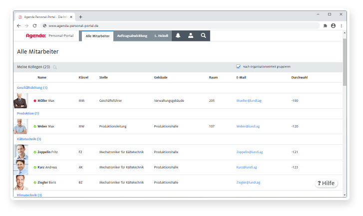Kollegen auf Geschäftsreise oder im Home-Office haben Zugriff auf Zuständigkeiten, Vertretungsregelungen und direkte Firmen-Durchwahlen. Mitarbeiter überblicken den Urlaubskalender für ihr Team bequem von zu Hause aus per Smartphone – und stellen sofort den Urlaubsantrag. Gleiches gilt für Führungskräfte: Selbst von unterwegs prüfen Sie Abwesenheiten, genehmigen Urlaubsanträge und sehen Personalauswertungen ein.